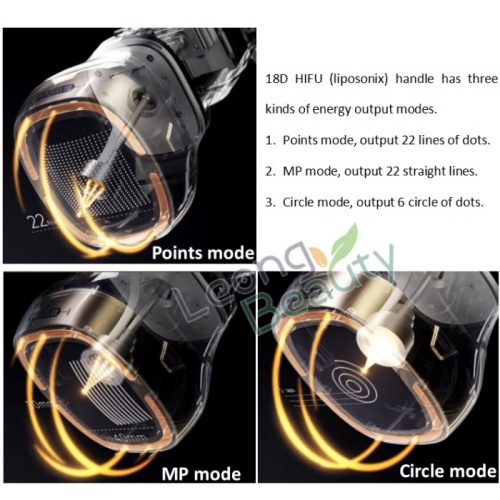 Toinen kahva on nimeltään 18D HIFU, se Siinä on 3 tilaa, 22 suoraviivainen tila, 22 riviä pisteitä ja ympyrätila.